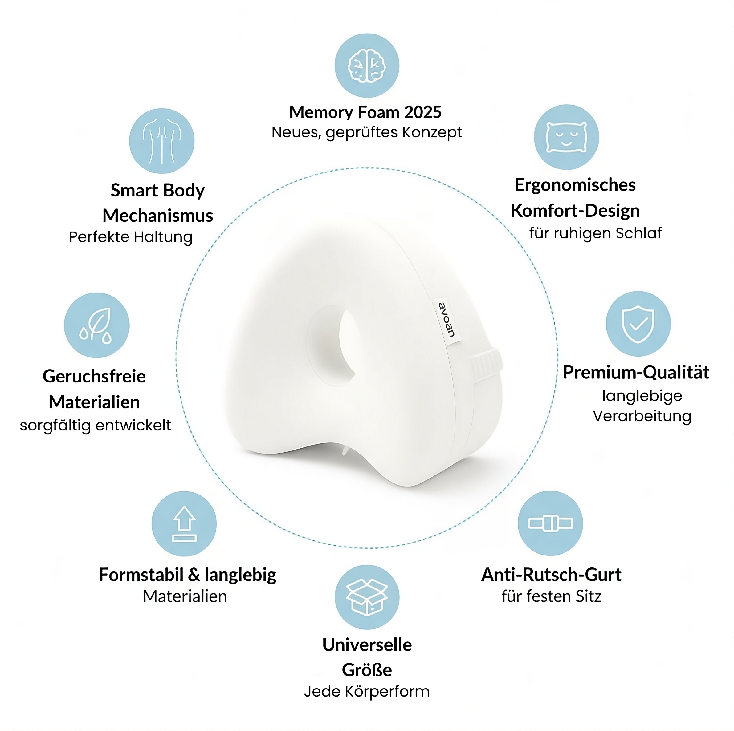 Herzförmiges Design für natürliche Ausrichtung von Beinen, Hüfte und Rücken. Hochwertiger Memory-Schaum passt sich an und bleibt formstabil. Mit elastischem Band für sicheren Halt die ganze Nacht. Atmungsaktiver, waschbarer Bezug für hygienischen Komfort.